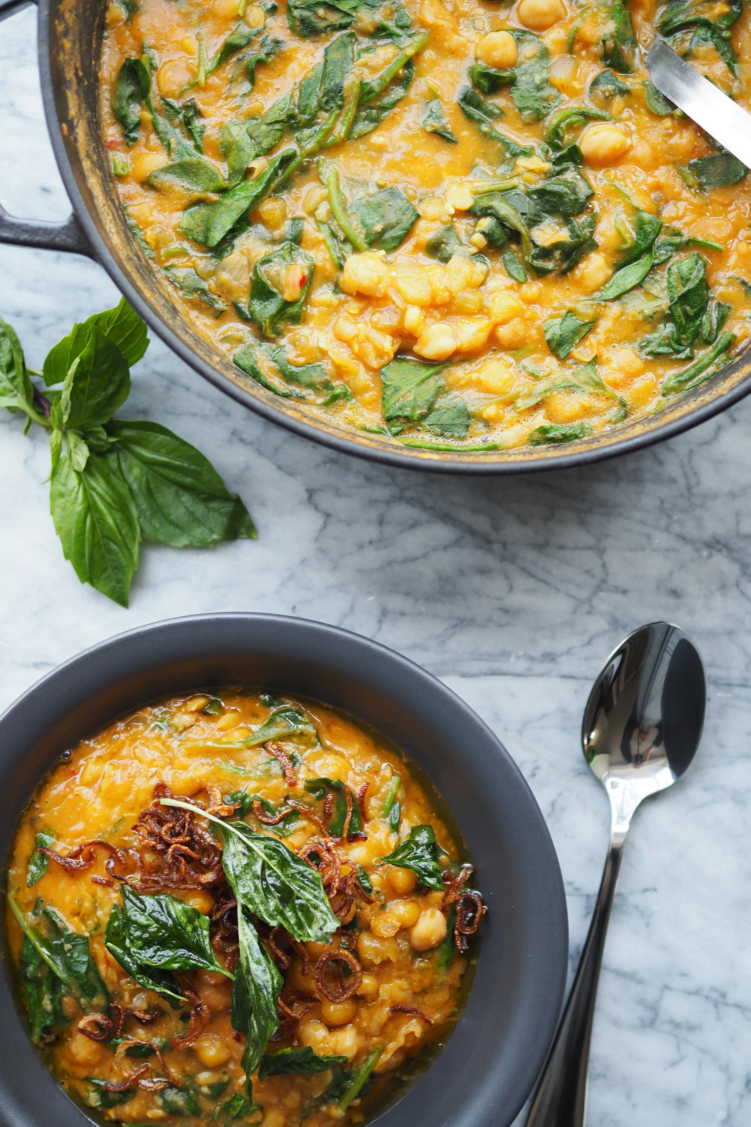 This chickpea based soup is spicy, hearty and full of spinach. The added texture from the sizzled shallots and basil make it feel like so much more than a bowl of soup. We enjoyed it with a slice of sourdough bread, toasted on the stovetop in some olive oil. comfort in a bowl!